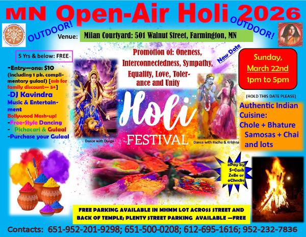 Dear Friends and Lovers of Holi - Festival of Colors: Please note: New Date - March 22nd You are cordially invited to participate in MN Open-Air (outdoor) celebrations in Milan Courtyard on Sunday March 22nd, 1pm to 5pm. Also celebrating