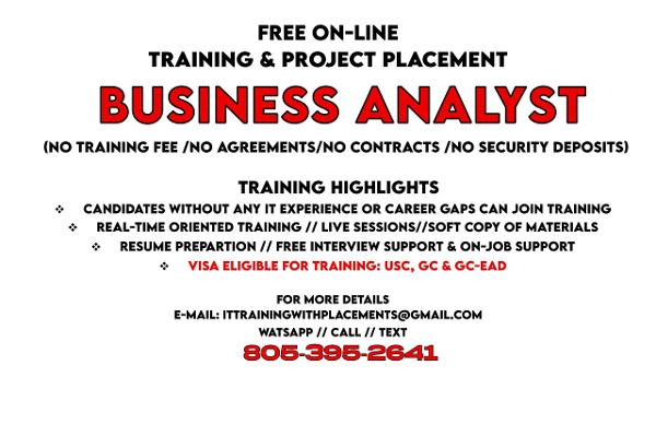 Free Online  Business Analyst  Training & Placement (No Training Fee OR Security Deposits ) // (No Agreements OR Contracts)